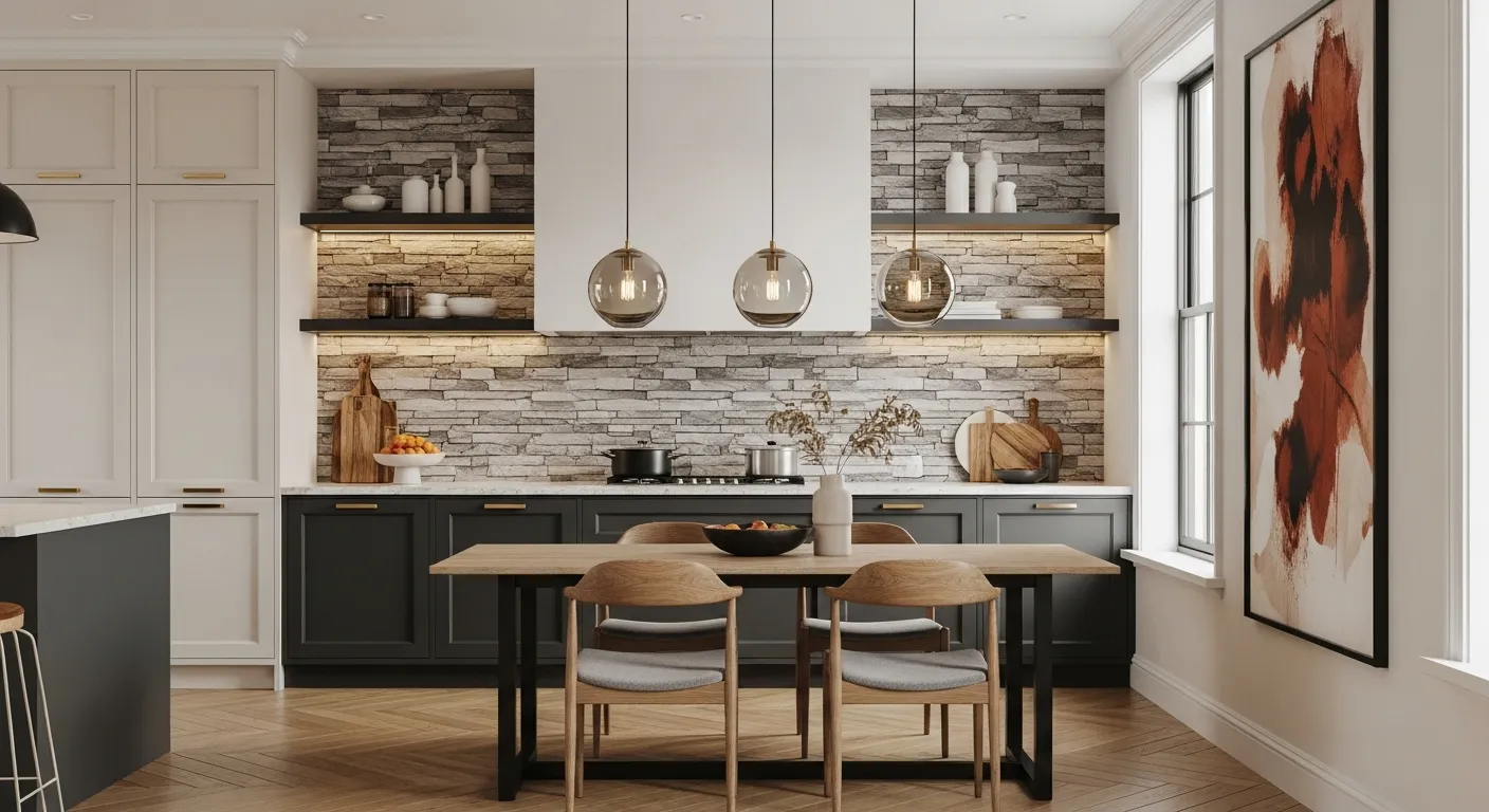 Dans les cuisines ouvertes, le mur de séparation (quand il existe) ou le retour de cloison joue un rôle de transition entre les deux espaces. L'adhésif mural permet de marquer cette transition avec style - pierre côté cuisine, autre finition côté salon, ou un même revêtement qui unifie les deux espaces.